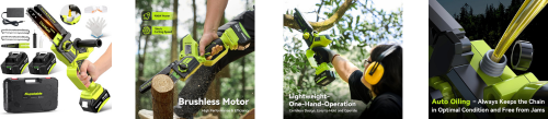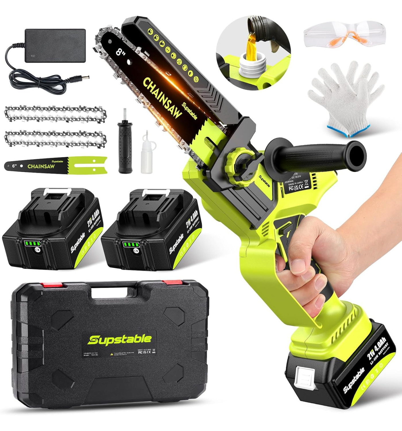 ver másSupstable Mini Motosierra a Batería 8 y 6 Pulgadas, 8000 mAh Sierra Eléctrica Podar Árboles, 900W, Lubricación Automática de Cadena, Ajuste sin Herramientas, Compatible con Makita Batería 18V