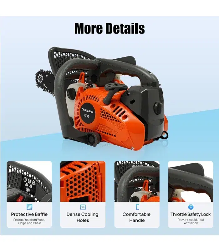Potencia profesional para trabajos exigentes con la Motosierra “BAOCHADA Motosierra de gasolina 900 W 25 cc“, equipada con motor 2 tiempos de alta cilindrada que ofrece potencia superior para cortar madera dura y ramas gruesas sin esfuerzo. Su sistema de refrigeración por aire forzado con múltiples orificios de ventilación mantiene temperatura óptima durante uso intensivo, mientras que el guardabarros integrado protege de virutas y detritos. Incluye arranque manual mejorado, empuñadura ergonómica antideslizante, lubricación automática de cadena y freno de seguridad automático. ¡Diseño modular para fácil mantenimiento! Ideal para profesionales forestales, jardineros y trabajos domésticos exigentes. Compra ahora y domina cualquier proyecto de corte con potencia garantizada.