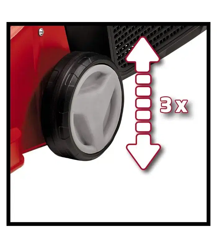 • Versatilidad y Precisión en el Corte La altura de corte se ajusta mediante un innovador sistema de una sola rueda con 3 niveles diferentes, permitiendo un ajuste preciso que se adapta a cada necesidad específica del césped. Las ruedas grandes de gran superficie protegen el césped durante el corte y permiten maniobrar sin esfuerzo incluso en terrenos irregulares o difíciles.